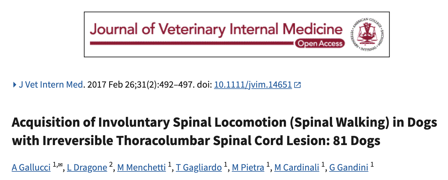 Gallucci A, Dragone L, Menchetti M, Gagliardo T, Pietra M, Cardinali M, Gandini G. Acquisition of Involuntary Spinal Locomotion (Spinal Walking) in Dogs with Irreversible Thoracolumbar Spinal Cord Lesion: 81 Dogs. J Vet Intern Med. 2017 Mar;31(2):492-497. doi: 10.1111/jvim.14651