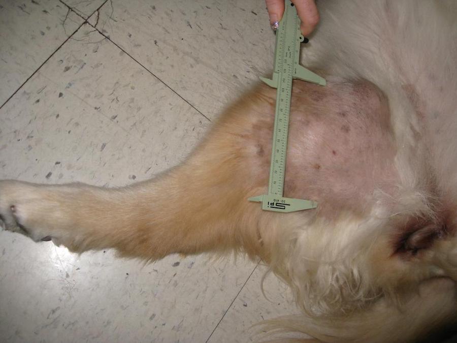 This time around, the owner said he was not doing great.  He was lame on a back leg, more so than any time previously – just toe touching in a stance, and partially weight bearing when walking.  I set about my evaluation.  His distal thigh was enlarged, proximal to the stifle (which has arthritis, but was NOT more tender or more restricted in movement).  I could palpate the popliteal lymph node easily although it wasn’t excessively enlarged, it was ‘easier to find’.  The enlarged region of the thigh was tight, and on pushing into it, tender as well.