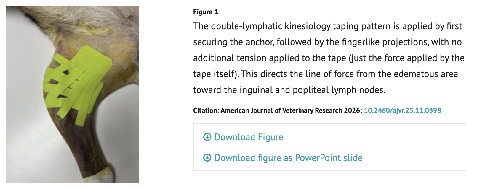 In the February 2026 issue of the American Journal of Veterinary Research, Brittany Ludwig and colleagues present a compelling randomized controlled study on the use of kinesiology taping (KT) to mitigate stifle joint swelling in dogs following tibial plateau-leveling osteotomy (TPLO). This procedure, a staple for treating cranial cruciate ligament rupture in canines, often results in significant postoperative edema during the early inflammatory phase. The authors hypothesized that applying KT in a double-lymphatic pattern immediately after surgery would significantly reduce swelling within 24 hours compared to no taping.